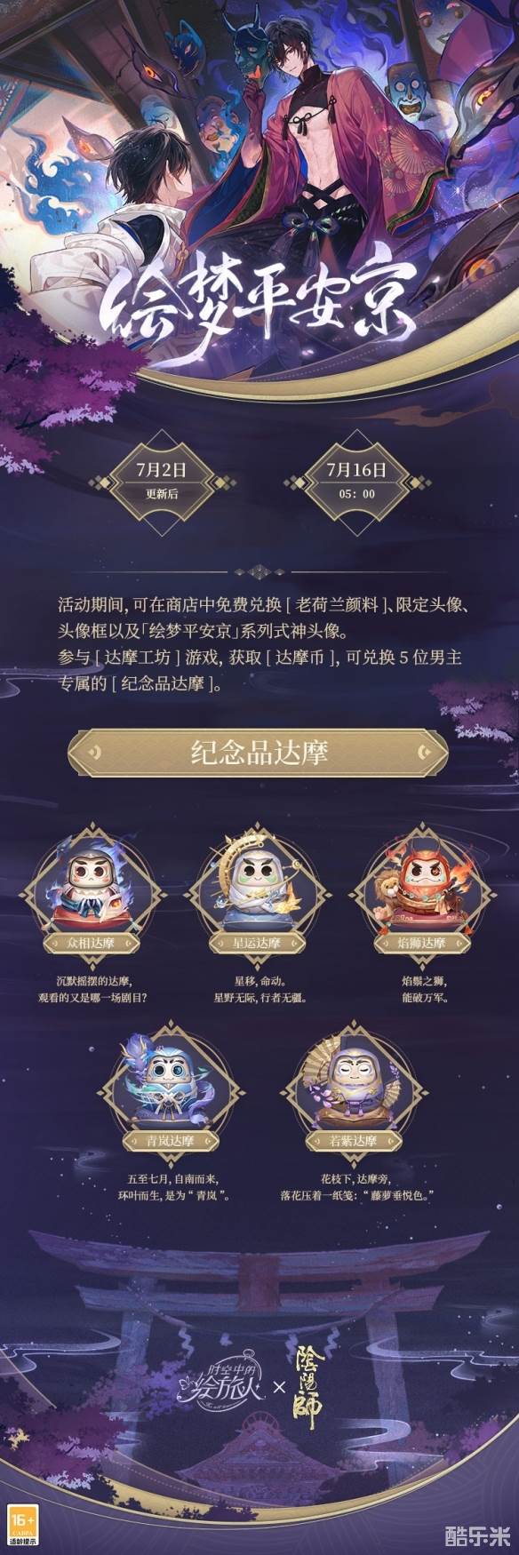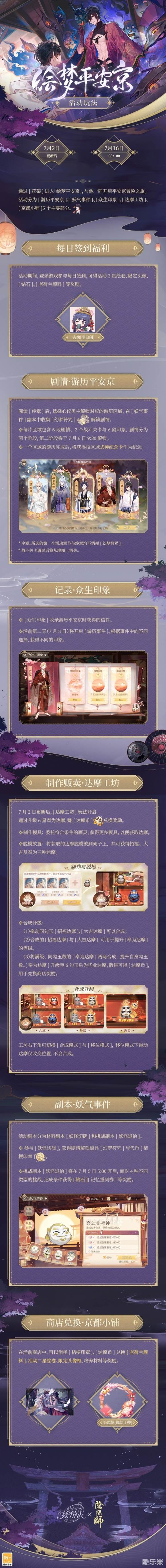 活动分为【游历平安京】、【众生印象】、【妖气事件】、【达摩工坊】、【京都小铺】5个部分。