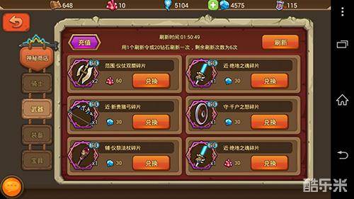 此外商店中有多种方式贩售武器,便宜实惠但是要碰运气哦。比如特卖商店不定期会以便宜价格限量出售一些高级装备。神秘商店可以使用包括钻石、粮草在内的各类资源兑换各类装备碎片。宝藏商店则可以投入钻石寻宝,以小博大,有可能以很少量的钻石投入获取高品质神装哦。