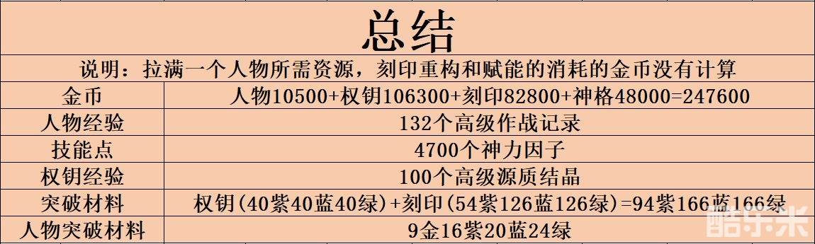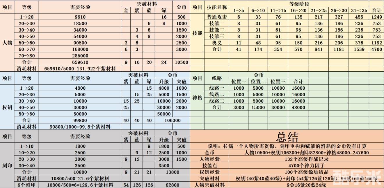 资源消耗,一图搞定,花费两个多小时从游戏一点一点测
