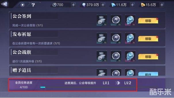 加入公会之后,成员们每天都要完成公会任务。公会任务不仅仅是你可以获得贡献奖励、战旗奖章等等。最主要的是,公会成员每完成1项任务,公会的升级条就会提升1点。当把这个进度条顶满之后,公会就会升级。升级之后的公会会有更多更好的福利。所以做公会任务很重要,为了自己也是为了整个公会的发展。