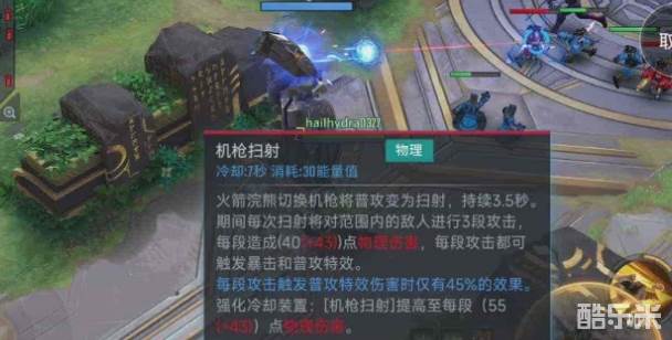 一技能机枪扫射:将普攻变为扫射,造成范围伤害,可触发暴击,强化装置后增加伤害。
