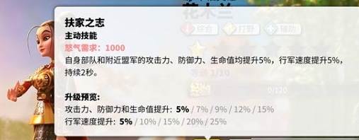 花木兰自身部队和附近盟军的攻击力,防御力,生命值提升15%,行军速度提升25%,持续2秒。