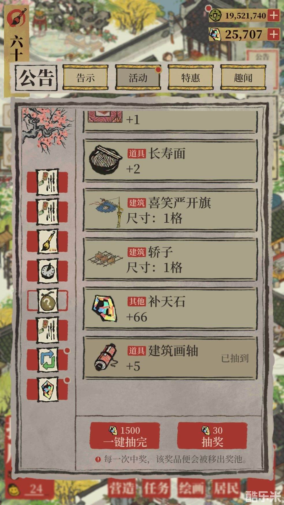 建筑画轴×5 + 长寿面×2 + 补天石×66!