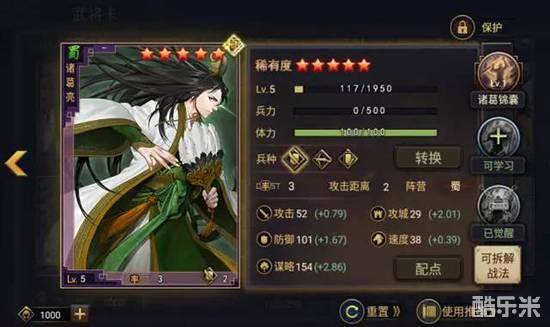 老规矩,先看属性面板。惊艳的谋略成长2.86,防御也达到1.52,非常优秀的五星武将。