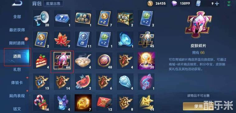 ②在游戏背包里,选择道具选项,在道具中找到皮肤碎片,然后点击右侧的使用,直接就可以进入碎片商店