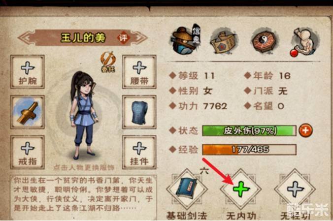 2.打开角色的属性界面后就可以看到右下角【无内功】上的【 】,点击【 】即可打开【内功】修炼界面;