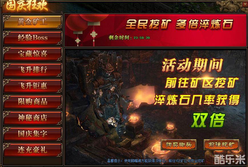 1、活动期间,玩家前往矿区挖矿,有几率获得双倍淬炼石;