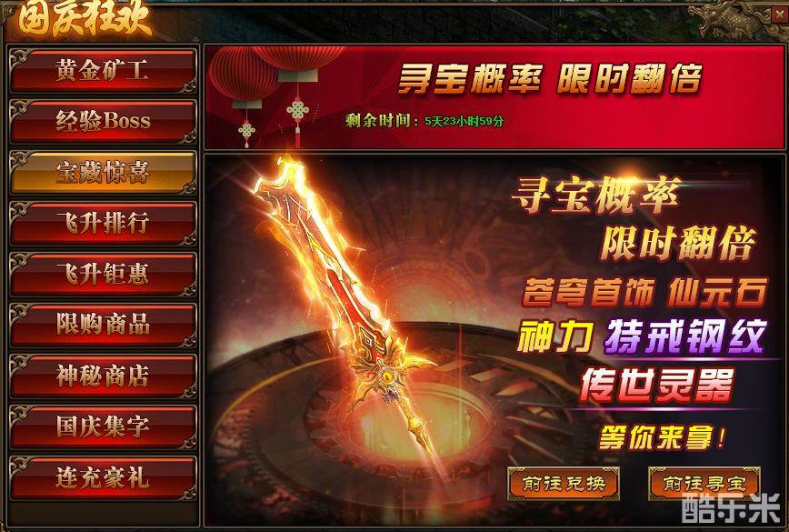 1、活动期间,玩家寻宝概率翻倍,高几率获得仙元石,苍穹套装,特戒钢纹以及<超强攻击>传世灵器-传世灵器·战;传世灵器·法;传世灵器·道;