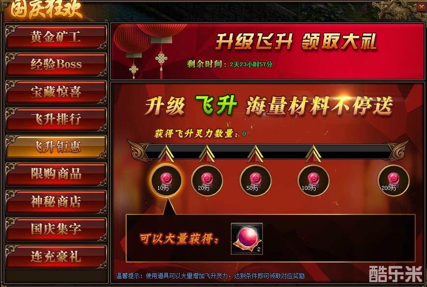 1、活动期间,玩家获得飞升灵力数量,达到条件可领取对应飞升材料奖励。