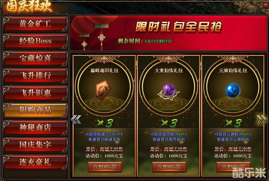 1、活动期间,玩家可在活动面板购买6种限购商品;(可翻页)