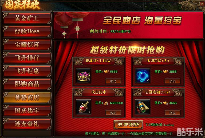 1、活动期间,玩家可在神秘商店中购买商品,商品可用金币,绑元,元宝进行购买;