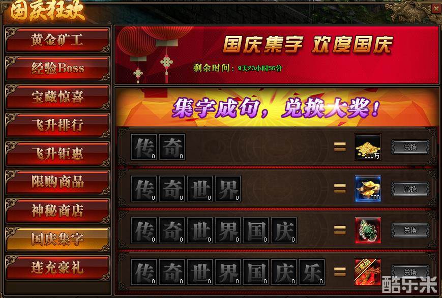 1、活动期间,玩家可通过击杀BOSS获得“传奇世界国庆乐”七字
