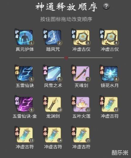 学了御龙水之后可以替换掉踏风或者真元其中一个,如果抗伤压力没那么大就选择【真元+踏风+仪】或者【真元+御龙水+仪】切记要带真元,不然一定会出现断盾的情况。*神通顺序仅作参考,实际情况还得根据各位道友的对手和自身条件来做调整