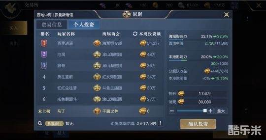 我们可点击下方“前往投资”进入个人投资界面消耗贸易币进行投资,投资除了能提升本港影响力、解锁本港购买货物、本港购买量外,还能增加海域影响力、分舰队收益。推荐大家在贸易币充盈的情况下,将每个港口的影响力都拉到100%,既增加海域影响力还能最大化收益。