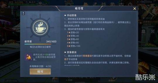 我们在贸易卖出货物后将增加相对应的疲劳,分别为:1星商品+20疲劳、2星商品+40疲劳、3星商品+60疲劳、4星商品+80疲劳、5星商品+100疲劳。