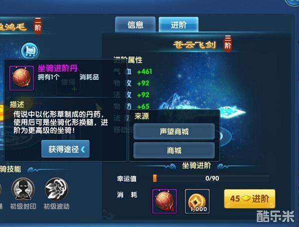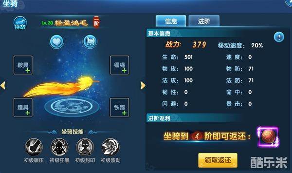 坐骑在游戏内和翅膀的作用是一样的。都可以给队伍增加额外属性,需要进阶来强化坐骑的属性。