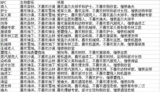泰拉瑞亚npc喜欢的地形和邻居是什么?
