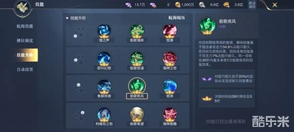 海战技能有专有的技能强化系统。除解控和减伤两个通用技能外,冒险者可以针对单个槽位消耗银币进行强化,强化等级同冒险者等级。单个技能可以通过获取对应的技能书进行升阶,获得额外效果。