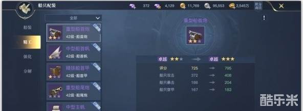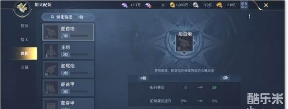 冒险者还可以针对单一的船装部位消耗强化源石和银币进行强化,强化到一定次数可以进阶,每次进阶额外获得船装部位综合属性提升。船装部位的强化不受船装影响,即便没有装备船装也可以强化。