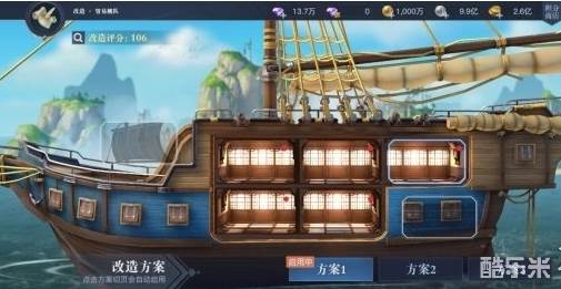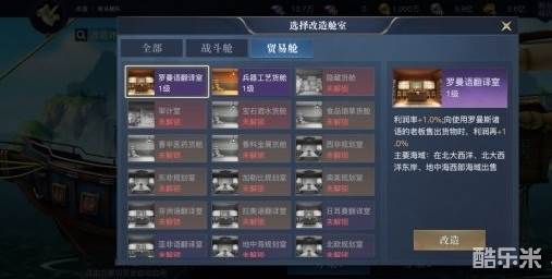 船舱改造是船只系统中的自由搭配系统。根据冒险者的等级,最多可以解锁5个船舱,以及一个船帆和一个船甲位。船舱分为战斗舱室和贸易舱室两种,每个舱室都可以装备所有已解锁的舱室。为了便于区分,游戏会提供战斗配置和贸易配置两种方案,使用对应的方案后,会自动切换对应的舰队。