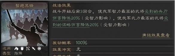【暂避其锋】则是作用于自家武将的,能够使智力最高的武将降低收到的兵刃伤害与谋略伤害的20%。
