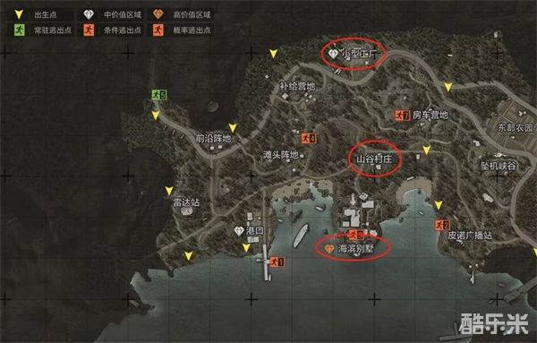 2、山谷地图中部有型工厂、山谷村庄以及海滨别墅这三个区域。小型工厂区域的物资种类是比较丰富的,在地下室有需要钥匙的房间和保险箱,对于喜欢玩伪装流捞一笔就走的玩家来说是很推荐的,同时其西南边的补给营地也不要忘了去搜刮一番,也能找到不少的武器配件资源。