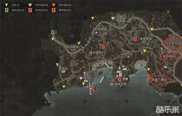 1、山谷地图的西边有前沿战地、港口以及雷达站,这些地方可以搜刮到一些重要物资。前沿阵地区域,能找到弹药箱、武器箱等,很小的概率也会翻到军用电台。而港口以及雷达站则能找到一些医疗资源、高级工具等,并且有钥匙房间,在里面也能找到一些贵重物品。