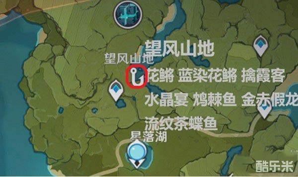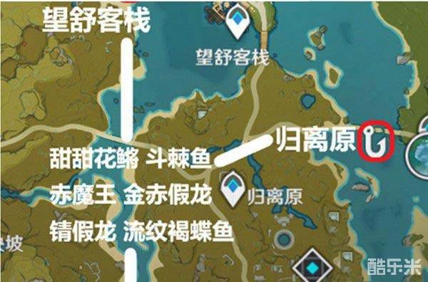 1、璃月渌华池,归离原,望舒客栈,图中红色圆圈标注的位置就是具体的钓鱼点。