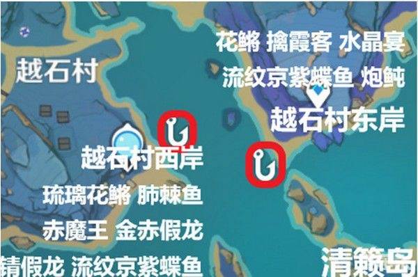 3、稻妻清籁岛越石村西岸,图中红色圆圈标注的位置就是具体的钓鱼点。此处有两个钓鱼点,有大概率可以钓到金赤假龙。