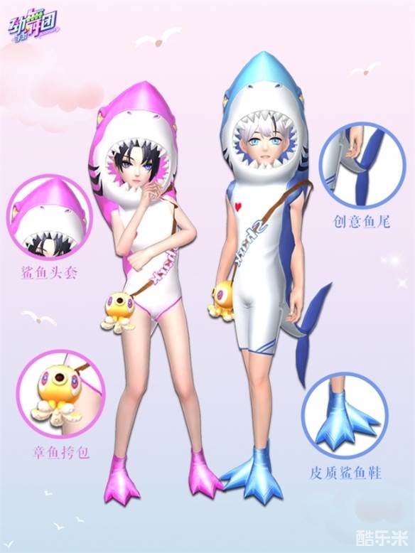 本期上新的活动服饰鲨鱼一族,男女款服饰分别采用蓝色、紫色作为主色系。女款鲨鱼一族为一袭可爱俏皮的鲨鱼泳装,满嘴尖牙的鲨鱼头套萌趣别致,搭配灵动可爱的章鱼挎包,再配上一双特制的皮质鲨鱼鞋,整体俏皮活泼、趣味可爱。穿戴如此萌趣别致的鲨鱼泳装,来温泉广场参加夏日泳池party吧!