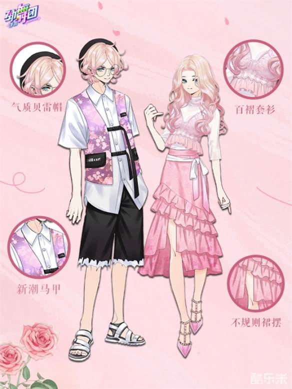 盛夏晴好,玫瑰娇艳,风景美如画,浪漫无边无际。本期商城上新温柔可人的玫瑰少年/玫瑰少女,穿上便是温柔本身。服饰玫瑰少女采用薄衫打底,搭配百褶针织吊带,尽显清纯温婉气质;再配上一条粉色不规则百褶长裙,裙上缀有渐变色花纹,腰间束以粉白渐变绸带,凸显窈窕身姿。穿上如花般娇艳美丽的玫瑰少女,来AU邂逅心动的TA吧!