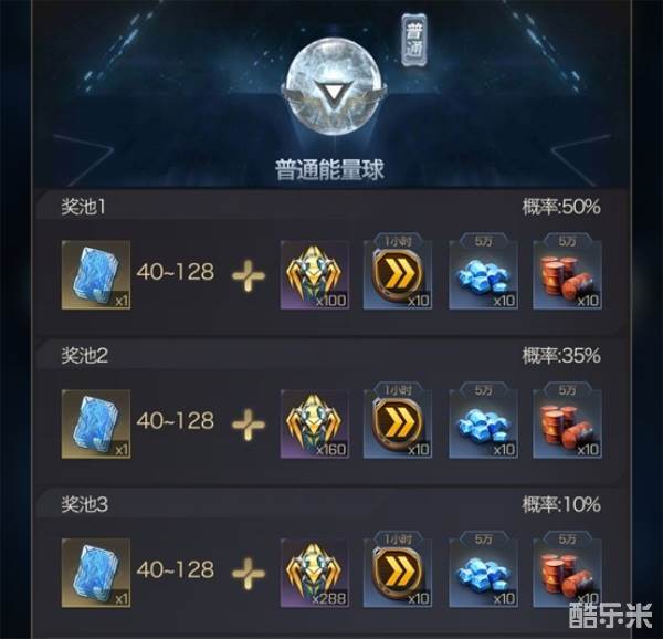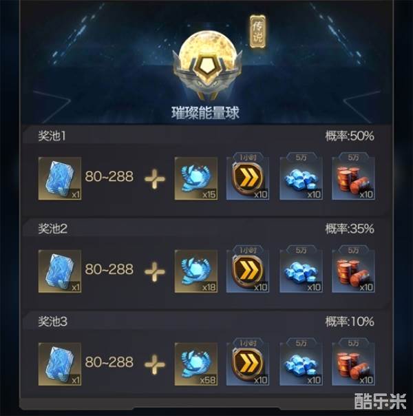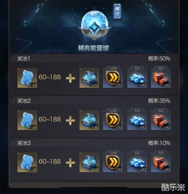 二、能量球分为普通能量球,稀有能量球,璀璨能量球,每种能量球里都有四种奖池,对应不同的奖励,开启能量球可获得四种奖池奖励之一(不同奖池奖励获