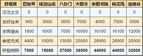 好感等级:势力好感度共有五个档,依次为泛泛之交、友好往来、志同道合、亲密无间、肝胆相照。