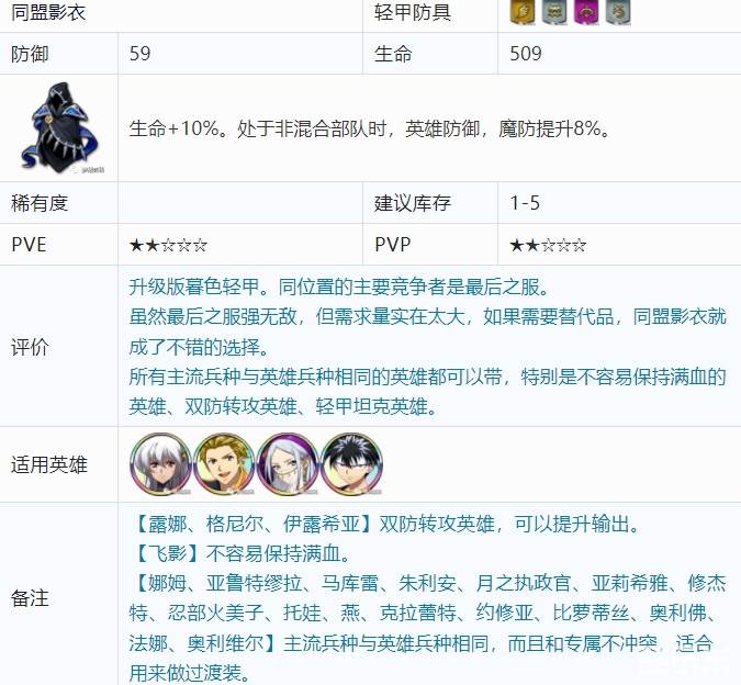 虽然最后之服强无敌,但需求量实在太大,如果需要替代品,同盟影衣就成了不错的选择。