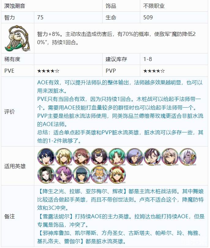 PVE只有当回合有效,因为只持续1回合。木桩战可以给起手法师带一个。需要用AOE技能打血量较多的群怪时也可以给起手法师带一个。