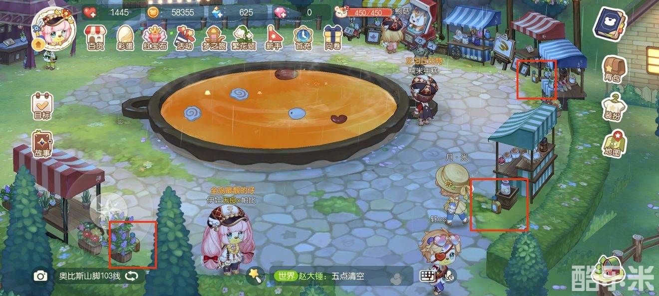奥比斯山脚收集我图中圈出的三桶机油后去摊位上方的机器点提交后可吹泡泡,次数不详,完成成就后还会有一个蓝色称号“泡泡机小能手”