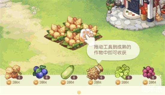 1.在奥比岛手游中玩家们可以种植多种农作物,不过有些玩家可能因为跳过了教程而不知道种完了之后怎么收菜,其实玩家只需要点一下出现那个手套,然后拖到菜上就好了。