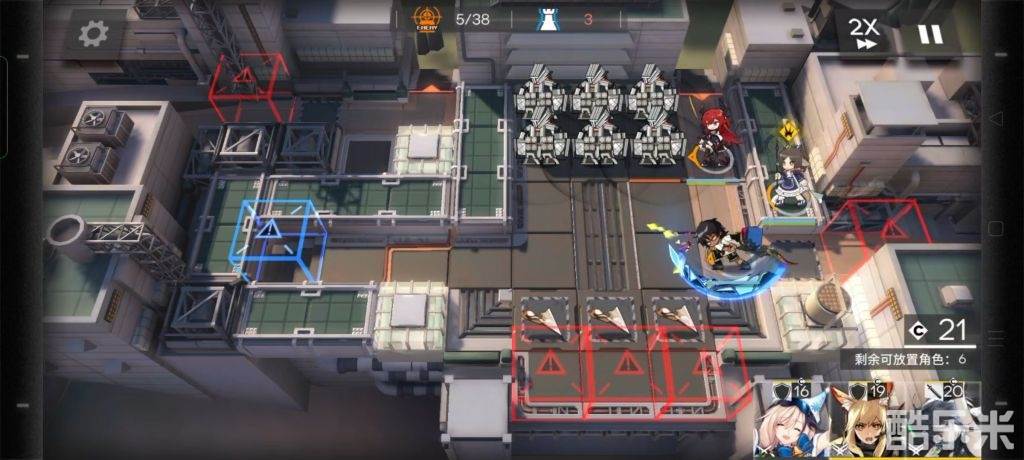 依次部署桃金娘,羽毛笔,阿米娅↓(阿米娅位置在下图棘刺位置,技能好了就开打掉装甲后就换棘刺朝左)医疗←,小火龙→,最后2重装。