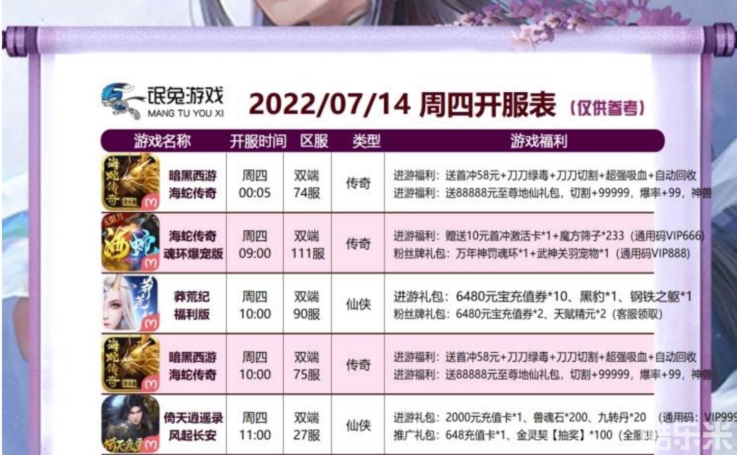 | 莽荒纪-福利版 | 90区( 苹果- 安卓) | 2022-07-14 10:00:00 |