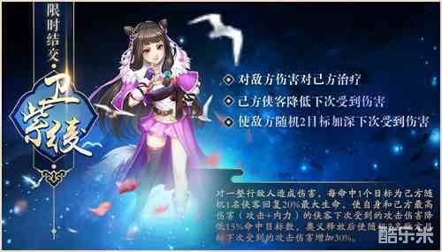 作为逍遥谷最美侠客的卫紫绫此次也再次返场回归!卫紫绫奥义对一整行敌人造成伤害,每命中1个目标为己方随机1名侠客回复20%最大生命,使自身和己方最高伤害的侠客下次受到的攻击伤害降低15%命中目标数,奥义释放后使随机2名敌方目标下次受到的攻击伤害增加30%。