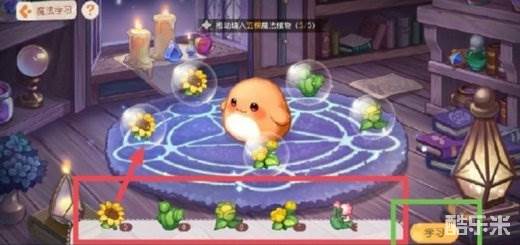 随后找到阿拉斯,点击魔法进入界面,点击小精灵,从下面菜单栏中随意选取五朵花拖动放入气泡中后点击“学习”即可学习魔法。