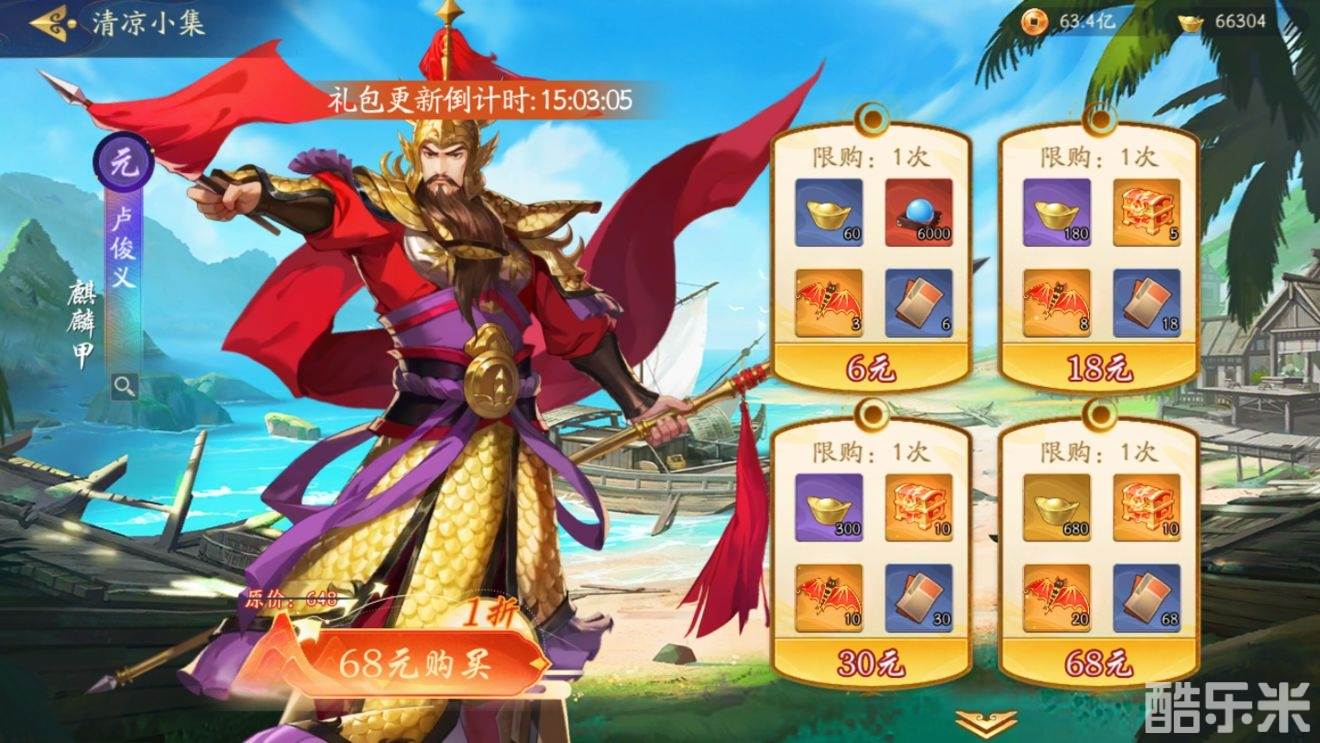 售卖各价位神兽符礼包和一张68元的卢俊义本体