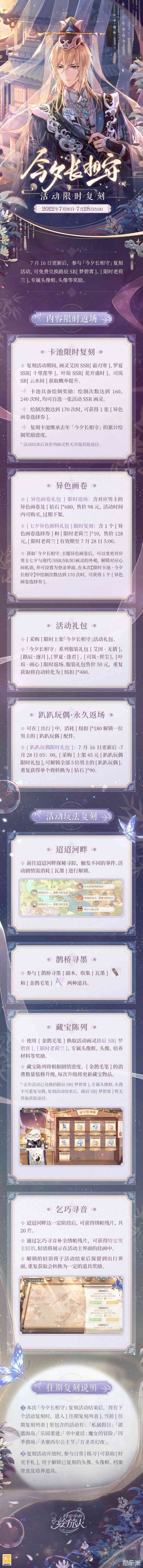 7月16日(周六)更新后-7月28日05:00,「今夕长相守」限定卡池、主题异色画卷、出行配件【趴趴玩偶】及相关礼包返场。参与复刻活动,可在商店中兑换路辰SR【梦碧霄】、【限时老荷兰】等奖励。