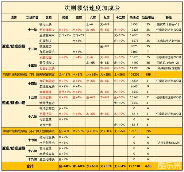 1、下图为灵界功法中带有法则速度加成的功法,顺带说一下很多人提到的法则无用论,虽然说现版本法则等级的压制效果不显着,而且返虚到1000级会卡一波,且2000级就圆满了,但是纵观游戏中的每个系统都是打一个资源获取的时间差。
