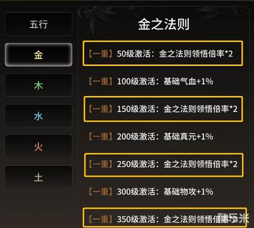2、升级时金木水火土五个依次升级到50级,然后再依次升级到150级、250级、350级、450级,这样升级速度才最快。
