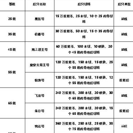 《黎明之海》中不同的等级可以建造不同的传奇船只,共有两类传奇船只,分别为贸易船只和战舰,建造只所用的材料也各不相同,各个等级传奇船只如下表: