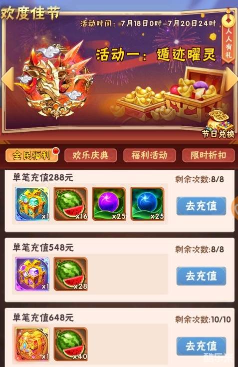 在活动期间少年们单笔充值至指定金额,即可获得遁迹曜灵二选一、虎虎生威碎片箱、玄金名将五选一、兵符精华碎片、西瓜等资源: