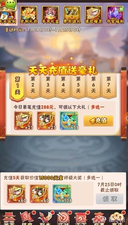 活动规则:活动期间每日单笔充值288元,就可以领取当日超值返利,累计充值5天还可以免费领取终极大奖!