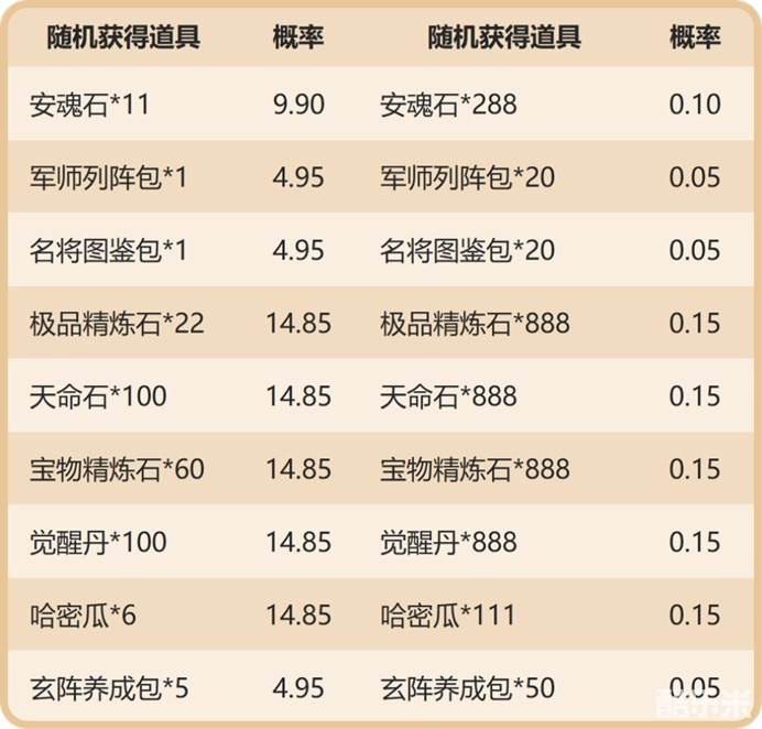 3.「夏日礼盒」可开出:哈密瓜*111、玄阵养成包*50、觉醒丹*888、天命石*888、极品精炼石*888、安魂石*666、军师列阵包*40、名将图鉴包*40、宝物精炼石*888、哈密瓜*6、玄阵养成包*5、觉醒丹*100、天命石*100、极品精炼石*22、安魂石*11、军师列阵包*1、名将图鉴包*1、宝物精炼石*60中的随机1种。