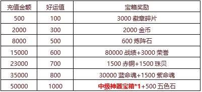 【活动内容】活动期间可通过充值金币获得好运值,积累好运值即可打开宝箱奖励,闪耀称号,全新神器,绝对超值的提升战力资源,尽在特惠好礼。